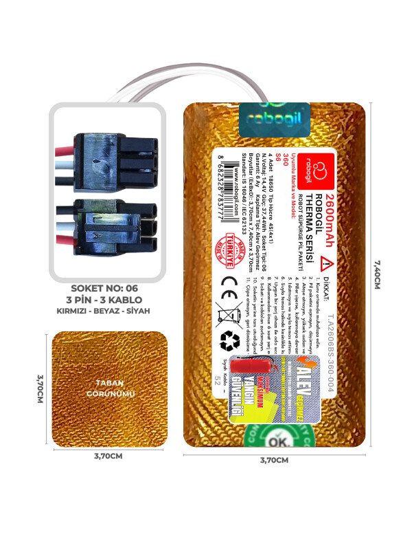 360 S6 2600mAh Pili Therma Serisi Alev Geçirmez Kaplamalı Uyumlu Robot Süpürge Bataryası T.A2606BS-360-004 Sıra:52